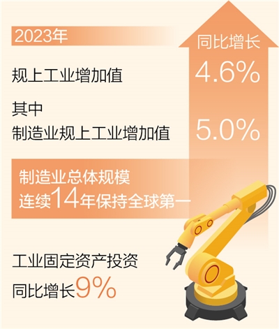 本报北京1月21日电(记者王政、刘温馨)记者日前从工业和信息化部获悉:2023年,全年规模以上工业增加值同比增长4.6%,较2022年提升1个百分点,其中制造业规模以上工业增加值同比增长5.0%,我国制造业总体规模连续14年保持全球第一。