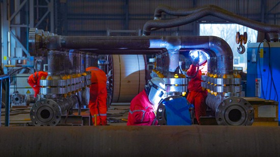 技能大师工作室内焊花四溅,海洋石油工程股份有限公司焊接王牌青年突击队正在为“深海一号”二期工程的水下中心管汇做交付前的冲刺准备。